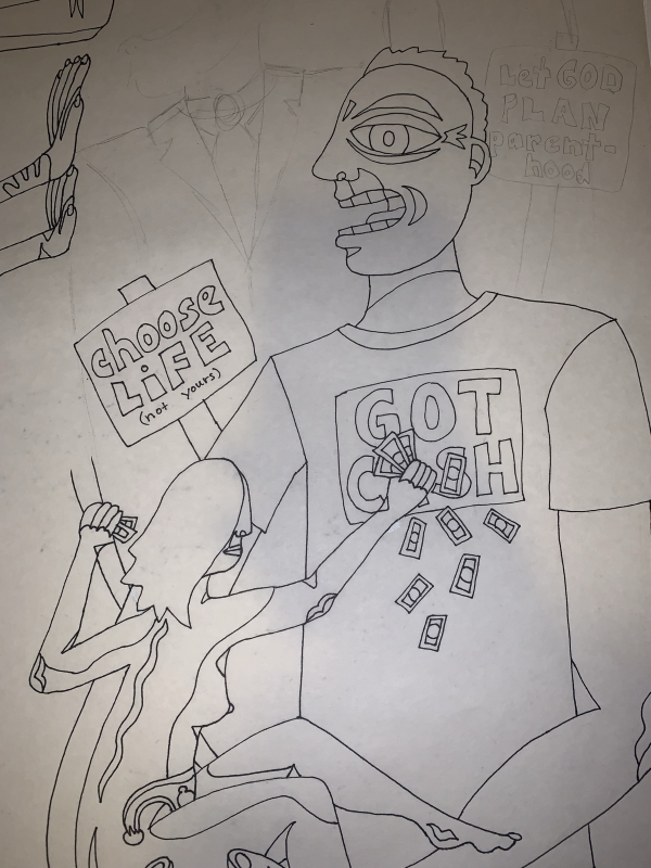 I roughed in some stuff on the right side when I started this, then started adding protest signs.