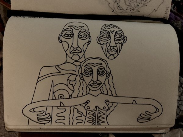 One of the reasons I have a hard time sleeping is that Art Brain doesn’t get a lot of time during the school day to process ideas. She tends to start at about 10 PM and since I’m going to bed earlier this year, it doesn’t leave much time for the work of it. I fell asleep last night to her taping more paper to the top and right side of this drawing so she could add storm clouds and another figure. She and I will talk later…I know she’s frustrated at only drawing for an hour a night, but last night, I was exhausted when I got home (at almost 6 PM) and had forgotten I was in charge of dinner (never defrosted, let alone marinated meat), so after food was handled (we went out) and my non-Art Brain had a chance to decompress, there was only an hour and a bit before bedtime. And I was exhausted. So I went for the sleep.