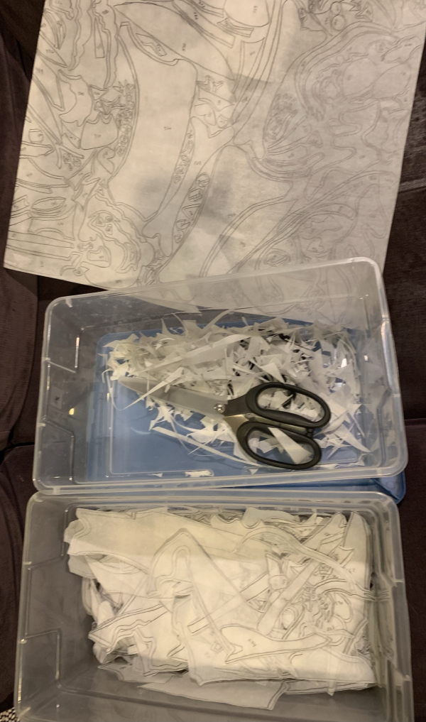 Got the third yard cut out and a goodly chunk through the fourth one, because it had lovely large pieces on it. I’m almost 8 hours in at this point. I do clump pieces together that will be the same fabric, like all the letters on a sign, so that saves cutting time at this stage. They don’t really need to be cut apart until the fabric stage. So there’s progress. I might be done by the end of the weekend. We’ll see.