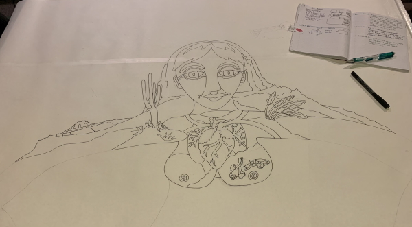 I have a pencil outline of the general shape, and there’s a hawk under the notebook, which just has lists of animals and plants from a variety of deserts. I need to make another earth mother. It’s where my head needs to be right now. I do love the last quilt…it’s all bound and sleeved and ready to be cleaned up for the photographer…