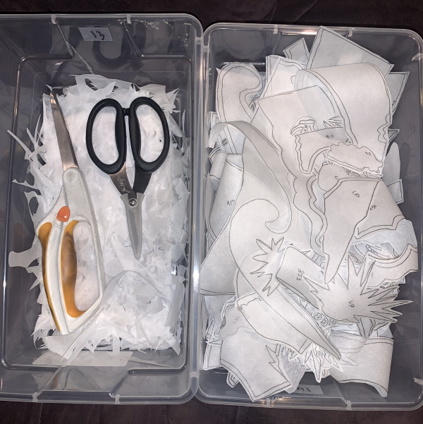 I mean, I can see the difference. The bin is definitely full. There’s definitely not another yard to cut out. That’s 9 hours of work there. Another hour and a half tonight of sorting pieces, and then…Then I need to clean my office so I can iron these to fabric…the cleaning part might kick my ass. It’s a disaster in here. And I’m in the middle of sorting through my fabrics, so I don’t really want to put stuff away if it hasn’t been halved, which is how I’m handling sorting through my fabrics. Whatever. We’ll see how I feel tonight. I had to be up early for a parent meeting this morning, plus union meeting after work. Yesterday was a slog getting kids through stuff they didn’t want to do (it wasn’t a video game or texting their friends, plus I apparently give THE MOST WORK of any of their teachers…sigh).