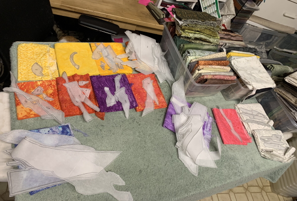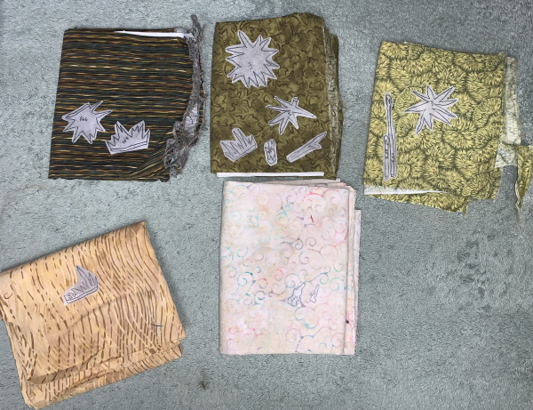 I did come back to my own quilt, which has a deadline, that honestly, I may not meet. I took a picture of these fabrics to remind me what I used for this plant, because there’s another one that’s more complicated further up the body, and I didn’t want to find those pieces now.