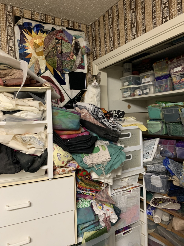 Kitten has taken to climbing the mountain of batting to survey me from up above. She’s trying to get up into the shelves (I’m not sure why)…