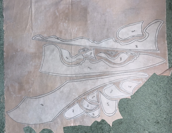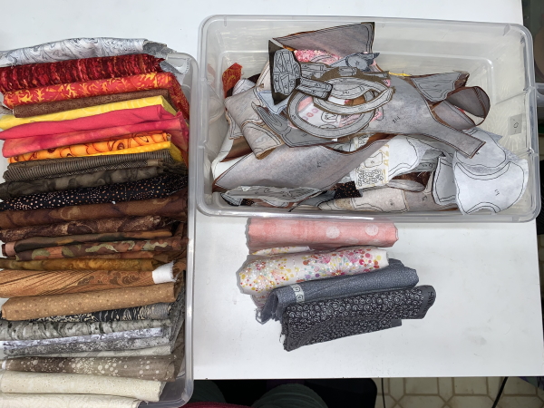 Usually I try to lay out the whole body at once, since it’s all the same fabrics, but it was going to be the 200s and the 300s and then the 700 and 800s and maybe beyond. I couldn’t deal with it last night. I just did the legs and the torso. And then put those fabrics in a pile for when I get up to the torso. It’ll be OK…although I only have small amounts of a couple of them…might need to substitute. That’s why I usually lay them all out at once…in case I run out of one, so I can juggle things before I start ironing down. Ah well. Juggling fabric is something I can do pretty easily. I think I’ll be fine.