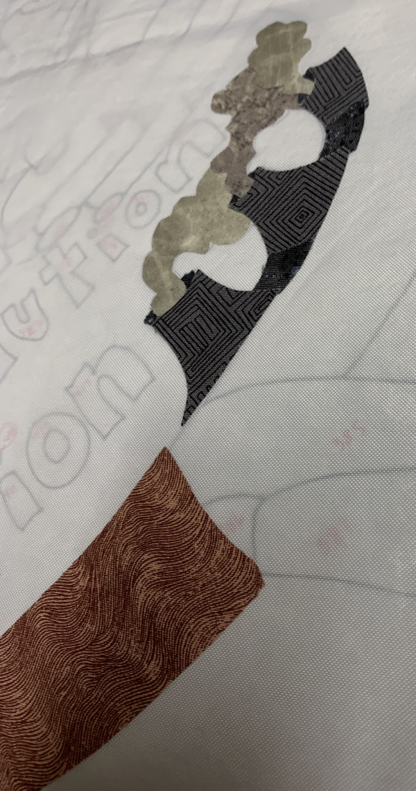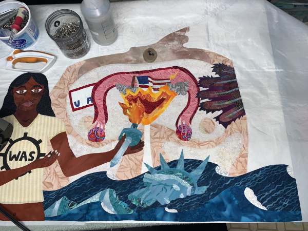 Then I ironed the robes of the large Supreme Court figure on the left, but forgot to photograph it, and then detached it and rolled it up, because everything was getting too big and out of control. I started ironing the left big head down…well, at least the neck and the nuclear power plant that will reside on his chin…