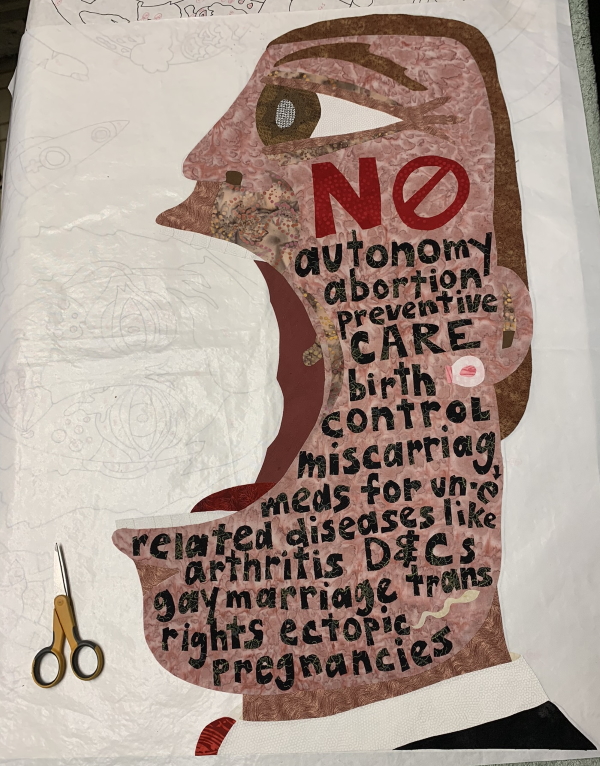 All the pieces are done, ironed together. I just need to make them fit. Ha! That’s always the issue. I love it when the quilt top is just one giant ironed-together piece with no holes in it, because it’s easier to get onto the background. Pieces like this with a little bit here and a little bit there, and they all have to fit together, which implies I ironed them together really well (ha!)…those are the hardest. I’ve got two big heads (here’s one of them from Friday night)…