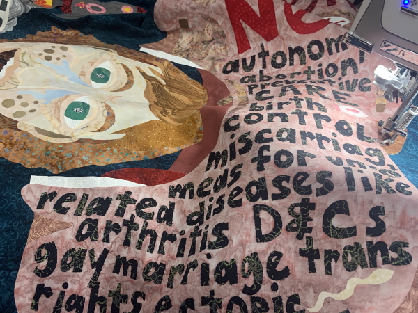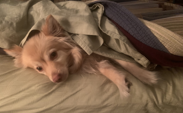 I’m pretty stressed about not getting more art time right now. I’m having to work weekends for school just to keep my head above water and mostly ahead of the game. I delivered art yesterday after school for an upcoming show, which is cool, but I need to MAKE more art, and it’s just taking me so long to finish a quilt because of the day job. I can’t get far enough ahead…this weekend is problematic because of all the Visions things happening, which I’m excited about, but also stressed, because I still need to grade and plan for next week, and I’m having a hard time with it. I think I need to post a bunch of stuff for school this morning too, but I have a morning meeting and a union meeting after school, so I’m not sure how all this will get done. OK. Well here’s a picture of the dog who wouldn’t move so I could make the bed this morning.