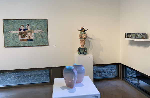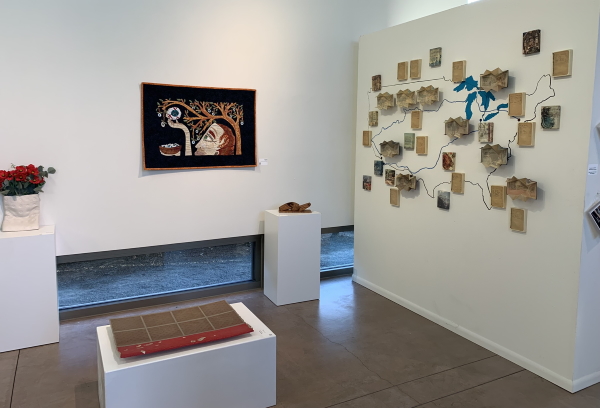 This one I can do: Nakedman (mine), then a piece by Cheryl Tall, A Year in the Leaf, an artist’s book by Charlotte Bird, and Kathleen Mitchell’s glass Revealed in the front.