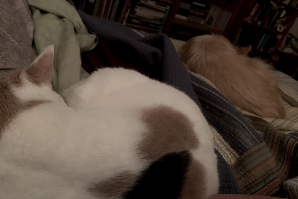 And the night before, the Man was playing a late show, so it was just me, Luna, and Simba for a while…well, Katie was on the floor, not sure where Nova was, and my cat has been living in my office lately.