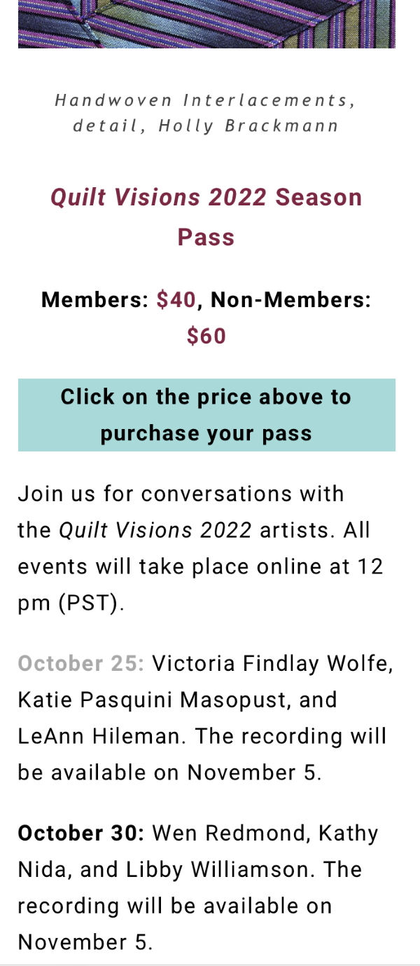 On Sunday, I also did a Zoom artists talk for Quilt Visions with Libby Williamson and Wen Redmond. If you pay for the series, you get to see all of them. They are all recorded, which is probably how I will be able to see most of them.