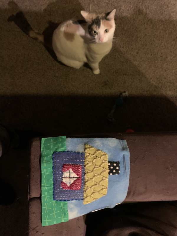Took me almost all damn week just to label it, clean the cat hair off of it, cut slats, roll it, and box it up. Sad but true. The bindings for the other two quilts are still sitting over here, waiting to be sewn on. Hopefully tonight and tomorrow. Handsewing is easier to do in little chunks. I have to commit a big chunk of time to sew bindings on. I don’t want to stop halfway to go to bed. I guess I could, but it seems silly.