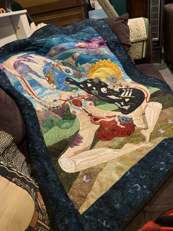 Lame photo hanging over the couch. This one is not huge. Now going into the holidays, I have an idea for the next big one, but I need the headspace to check deadlines and do some planning, plus I’d really like the fam to stage this one so I can see how all the body parts will go, but so far, I’ve gotten some dissension on that happening. Either way, I can’t get a big drawing going until after we do Xmas Day, which will be Boxing Day for us this year, so is it possible for me to NOT be working on a quilt for 7 whole days?