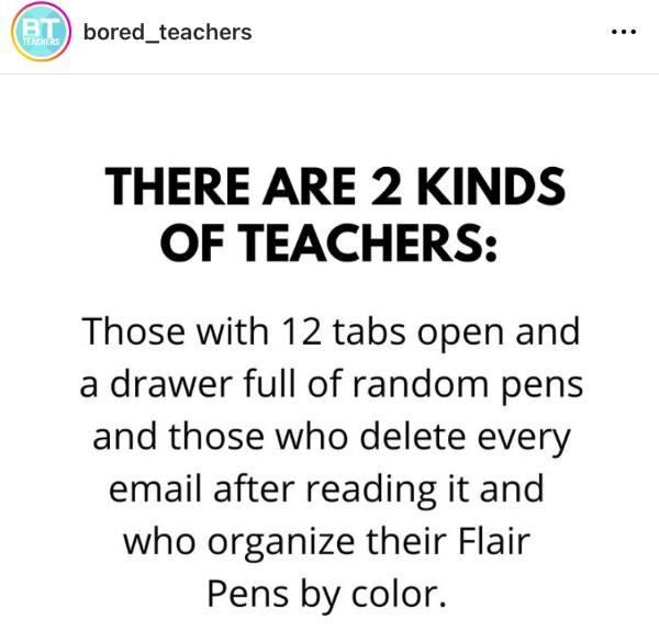 Um. I am both of these. Except I don’t delete emails after reading them. I might need them again. I delete a LOT of them, but not all of them. And 12 tabs is nowhere near enough. On this computer, which I don’t use for work as much as I used to, there are 23 tabs open. You can imagine that the work computer is much worse. It is. I organize my Flair pens by what I use them for: writing on docs in class (dark so it’s easy to see on the doc cam), light and bright for grading (make it cheery!), ugly colors I will never use but will never throw out (because that’s anathema). But I also have an entire drawer, another box, and random other locations where pens go to die. Or live free lives, depending on how you look at it.
