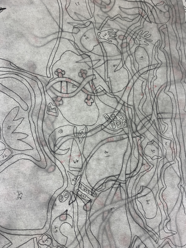 I thought I’d be further up the drawing by now, but no. It seems there are more pieces in the top half than the bottom half. Even though the bottom half is solid pieces and the top has a lot of open bits. More smaller pieces up top; bigger pieces down below. I have the upper torso and arms, plus head, plus everything she’s holding. And when I say arms, one is done, three to go. Yup. She’s got four. Like you do.