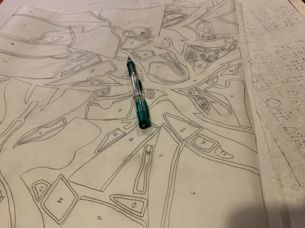 It’s a healthy pile of tiny pieces. Next step is to sort them (have to stand to do that), but if I do that, they’ll be sitting in boxes that I’m going to need for IDK how long. However long it takes me to make this much smaller (is it though?), less complicated (much less than half the pieces anyway) piece. Which has to be done in 50 days. Ha! Fuck me.