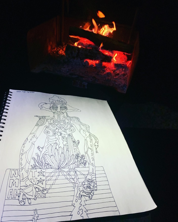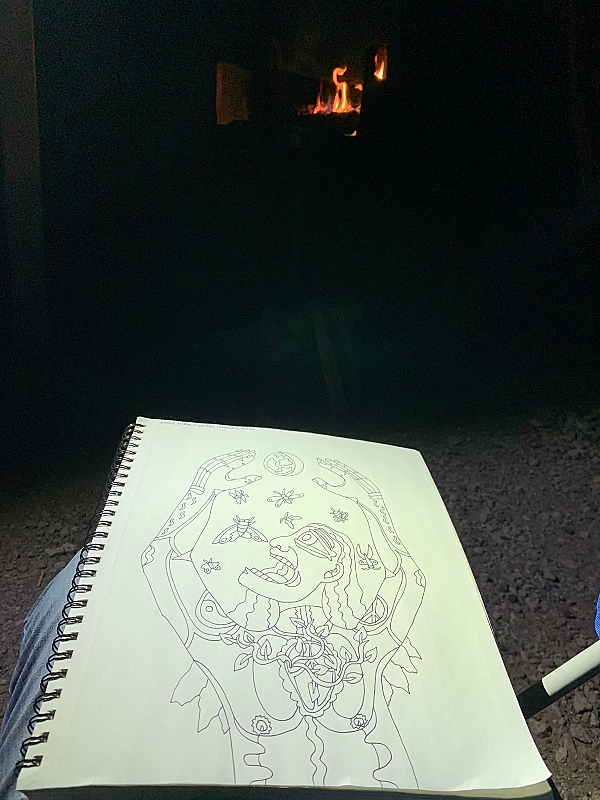 No fire pits, but we managed fires in the grills. Good thing…the Man can’t stand camping without the requisite staring into the fire and managing the fire. It’s fire TV. I do a little staring myself, but mostly it’s my drawing time.