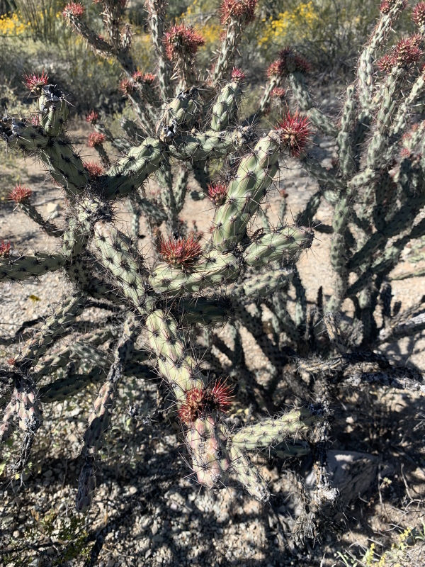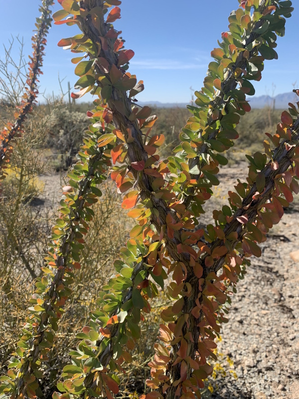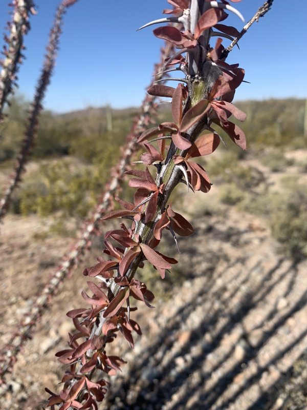 We did Victoria Mine, which was close to 5 miles when we finished; we should have started two hours earlier to beat the heat, but we didn’t. The ocotillo was just starting to leaf out, so some had flowers and no leaves, some had new reddish leaves, and some had green leaves.