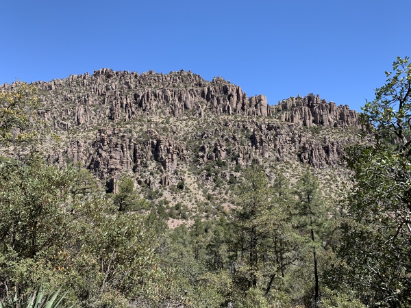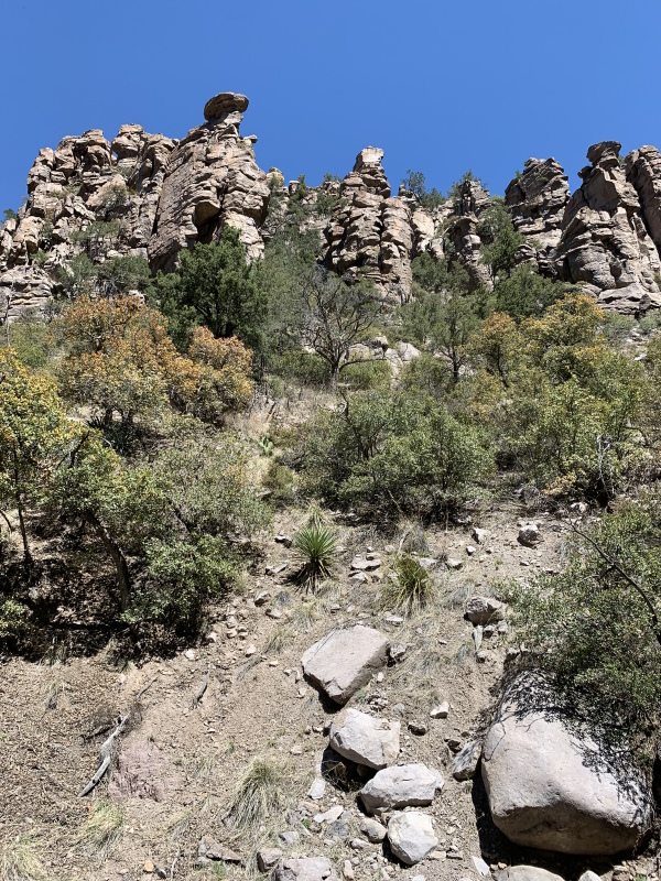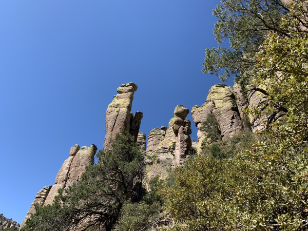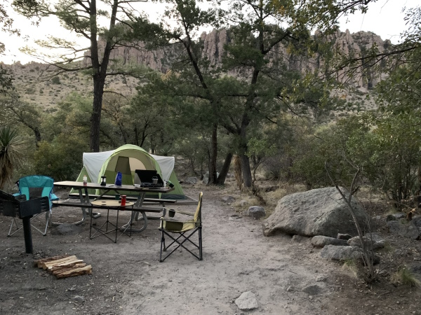 From Organ Pipe, we went up to 5500′ in elevation, higher where we hiked. It was cooler, but not enough during the day to really matter. We considered (and deconsidered…unconsidered? Removed from consideration) one hike due to the climb with the heat. We’re out of shape and heat is hard. But it was still a nice place to be, Chiricahua National Monument, which might be a National Park by the next time we go. Which will be hard for it, because there are only 26 campsites or something like that. We had a great campsite when we were there in 2018 (minus the loud kids in the two sites next to us), but I couldn’t get that one, so this is the one next to it.