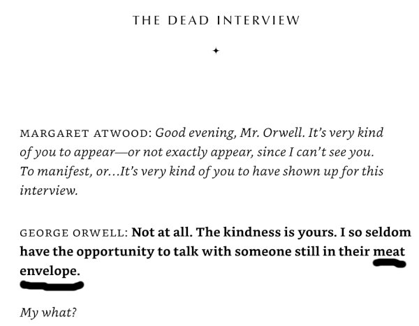 I’m reading two books at a time. Because I can. This one is Margaret Atwood’s collection of short stories, Babes in the Wood. I liked how Orwell referred to us living folks.