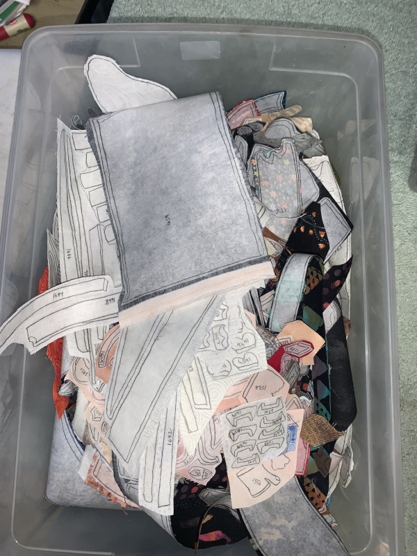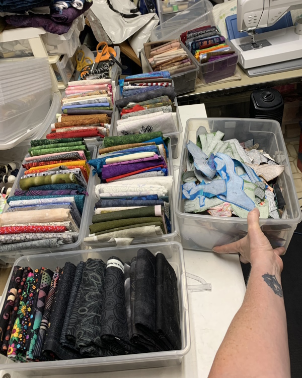 Seven bins of fabric at the moment. Crazy. It’s a lot. The goddess is all earth colors…not earth TONES, mind you…some bright greens and blues, with rocks and dirt below with the roots.
