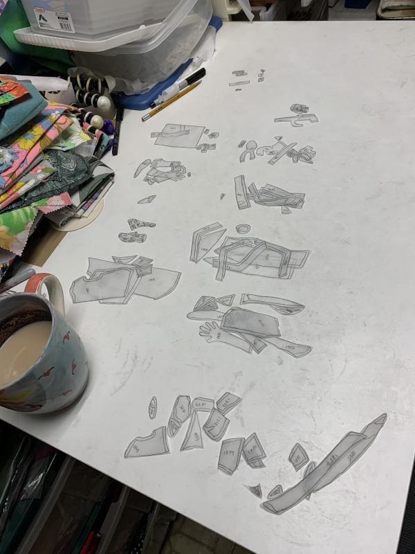 It’s Ruth’s robe and wings, plus hands reaching for a diploma, an LGBTQIA flag, and a hand with a gun. I’m hoping to finish tonight. It’s been a trip choosing all these fabrics. A long and sometimes torturous trip. Worth it, but not easy. Next up? Cutting them all out, then ironing them together. It’ll take all month, easy.