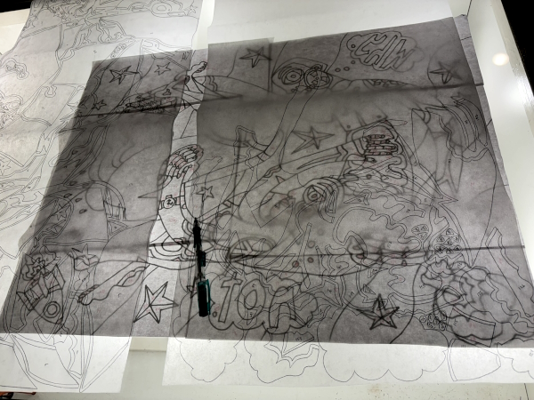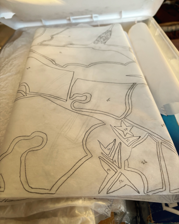 Art progress: Monday night, I was fine. I started tracing Wonder Under for the new quilt. I did the sky, mostly. I didn’t have a full hour.