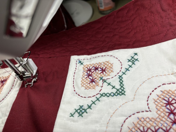 This stuff takes longer than people think, though. It probably took me a little over 2 hours to do the 9 white blocks, and I’ve put in at least an hour on the borders/sashing. It’ll be more than an hour to finish; I didn’t get quite halfway. Then put the binding on and stitch it down. So if you ask me to do something and I say no thank you, you will know why. I have little time. Just how long it’s taken me to get to this one shows that. I should be done this week, though. That’s my goal. Get it off my plate! I still need to draw the piece for the upcoming FIG show. Didn’t get to that this weekend yet either.