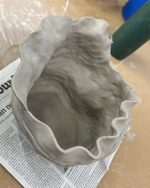Anyway. So there’s that. That pot is gonna slump some more. One of the issues of trying to build so fast in a short period of time. Normally I’d work for an hour and then let it harden a bit. Didn’t really have that option. Ah well. Not sure what I’m doing in there anyway, except playing. Which is fine. I’ll have a lot of pot shapes at the end probably. I’m not very good at the practicality of it.