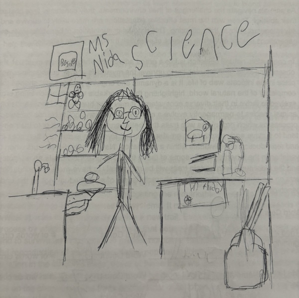 Be safe! There’s my sink, my eyewash, my doc cam, my rulers, my stick-figure body. All accurate.