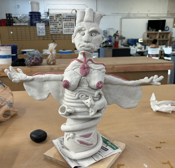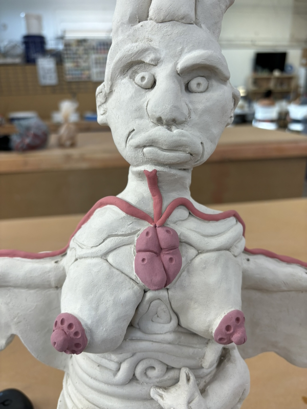 When I finished, I still had some time left before I needed to head for home. The winged woman piece has been drying for a while. I pulled her down at one point to fix some cracks. But I wasn’t sure how to glaze her. While I was in Maine, I would just let her percolate in my brain until I decided to do some underglazing first…
