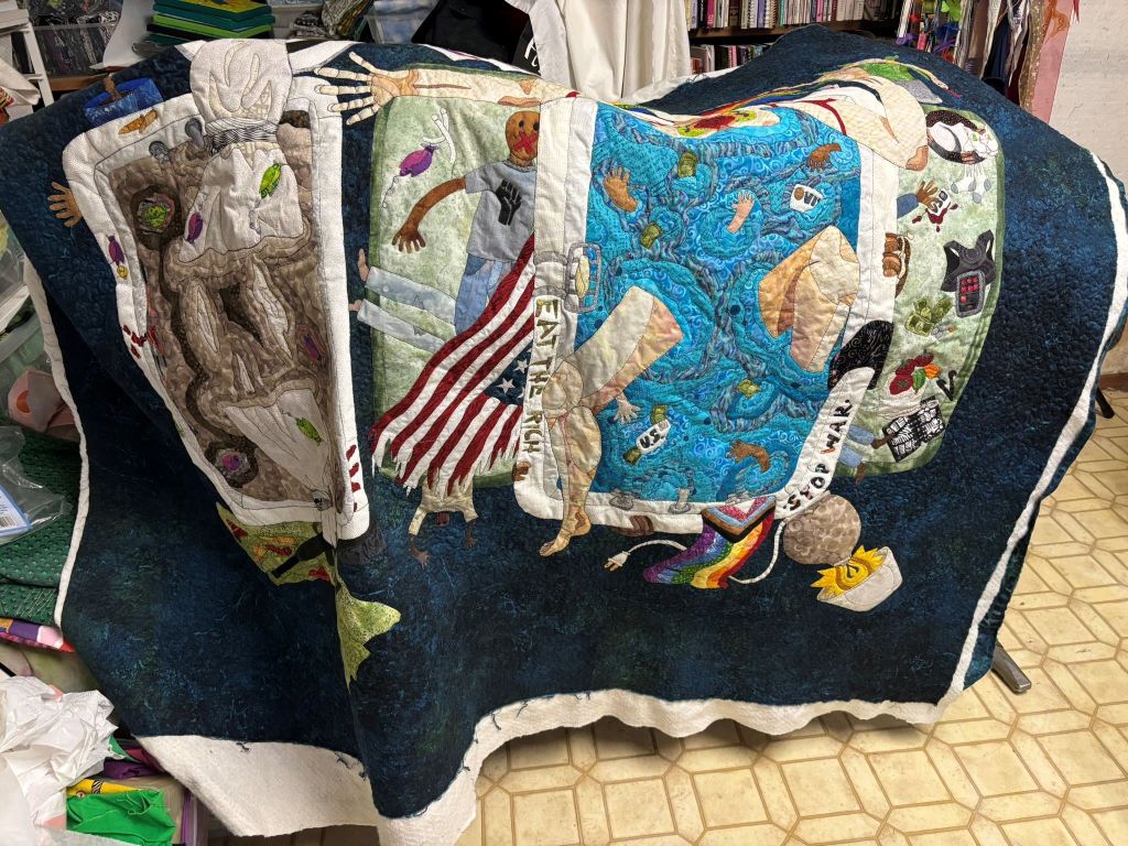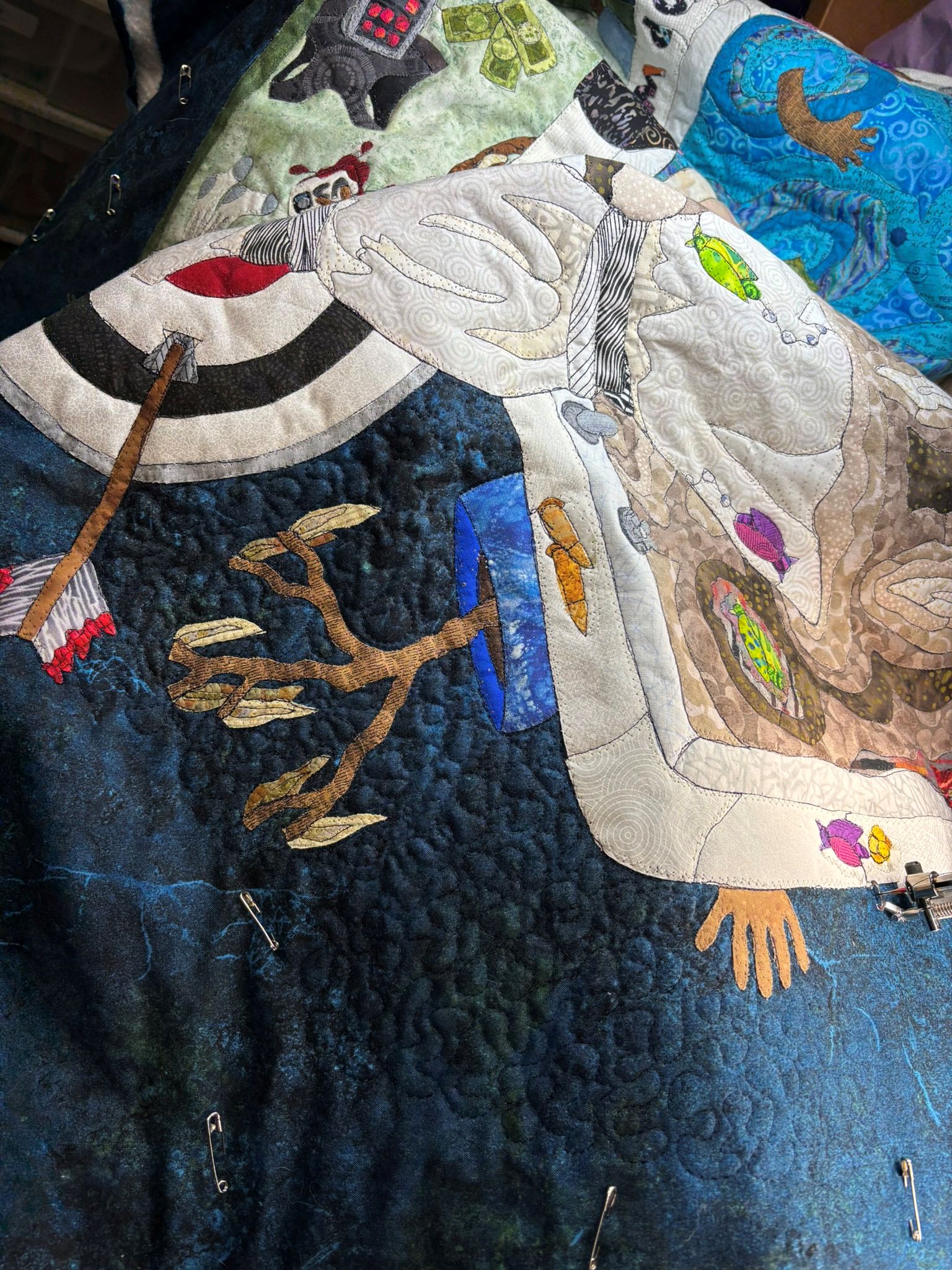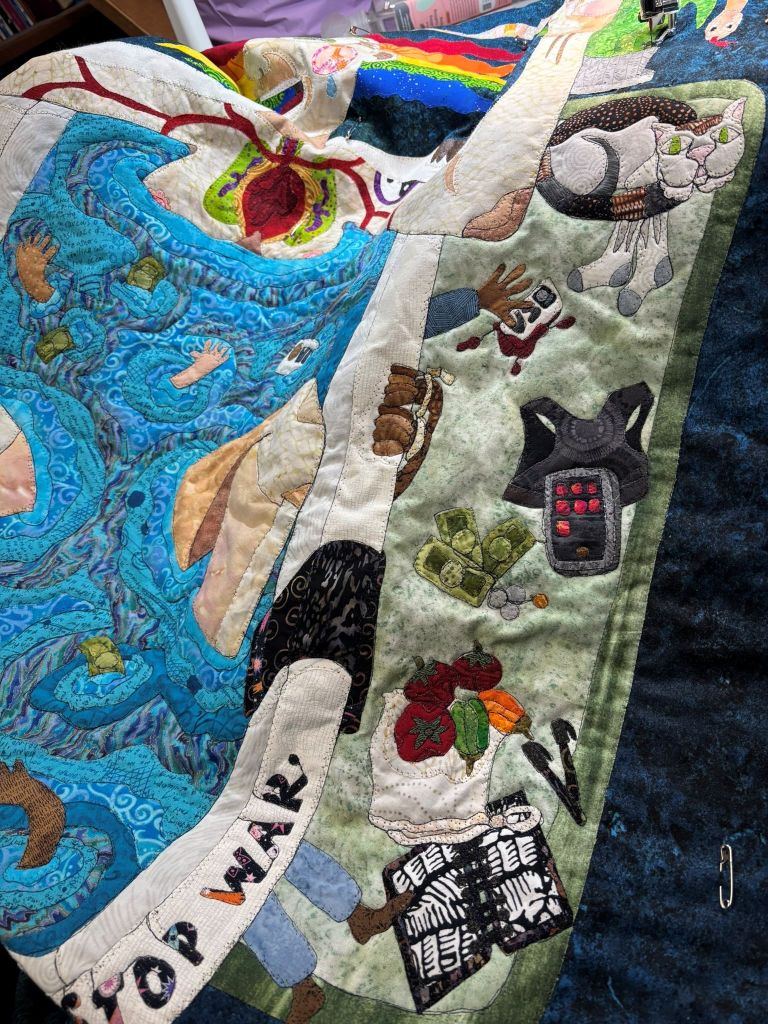 When I got the outlining done and started the background quilting, which was dark blue thread on dark blue fabric WHAT the ABSOLUTE FUCK was I thinking. On Sunday, I thought, oh I should quilt during daylight; it will be easier to see. Nah. It wasn’t. I finished quilting after 3 1/2 hours on Sunday…