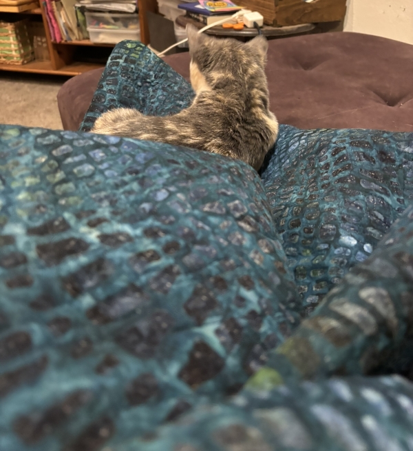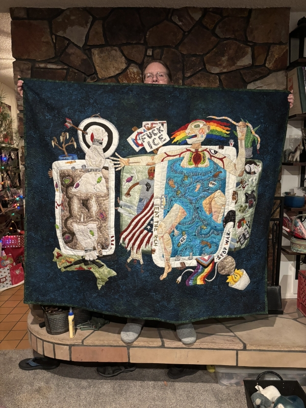 But today, I need to start the next quilt and clean shit and pack shit in a box I don’t actually have and figure out WTF is happening with everything before the end of the year. Aack. Lots of money and art stuff to deal with, not to mention the chaos in my office. And work…the day job. I need to do more of that. Don’t want to, but it’s got to get done. The yard too. So much stuff. It’s overwhelming. What does it mean when all your social media is decluttering videos? Yeah. That’s what I thought. But really, need to get a new quilt started because it has a deadline. I did research for it last night and I have the start of something in my brain. So if I just cut the paper the right size and sketch in what’s already in my head, I think I’ll be able to get the rest in.