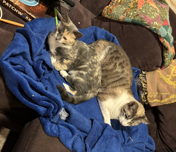 Scribble wants to cuddle, but the big cats are hesitant. It’s cold here at the moment (well, it’ll be 79 degrees later, but it’s in the 40s at night), so they are more conducive to cuddling, but mostly with humans and not each other.
