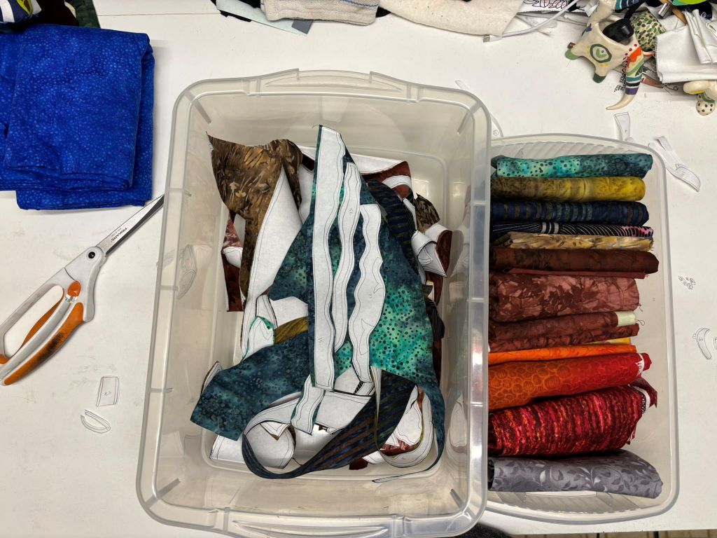 So I spent a goodly chunk of time Friday night and Saturday cleaning up the office, moving stuff around, trying to make space. I did pretty well, although I distracted myself with culling through the two orange drawers and one of the three red drawers. I go through the fabrics I’ve been collecting since 1990 and if it’s something I haven’t used much of, I chop a fat quarter off of it (I usually buy 1/2 yards) and put it in the donate bag. Then when I have enough (whatever that means), I box it up and ship it to a couple of charity organizations. Gives me room for more fabric and more choices. Plus I get to see everything I have in the stash, which is sometimes surprising. Then I tried to put away all the fabric from the last quilt.