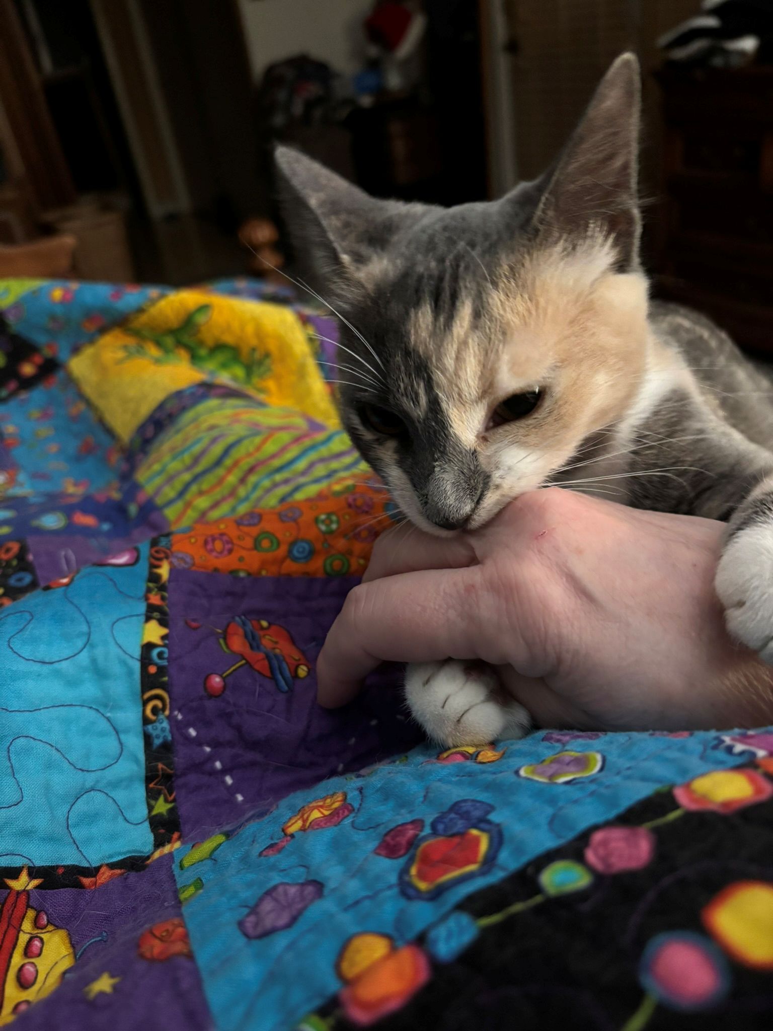 But she’s not always ready for actual bedtime. Unlike me. She’s a pretty gentle kitten though. She looks evil and vicious, but is not even breaking the skin. Just gently holding my hand in her mouth and paws. Sweet baby.