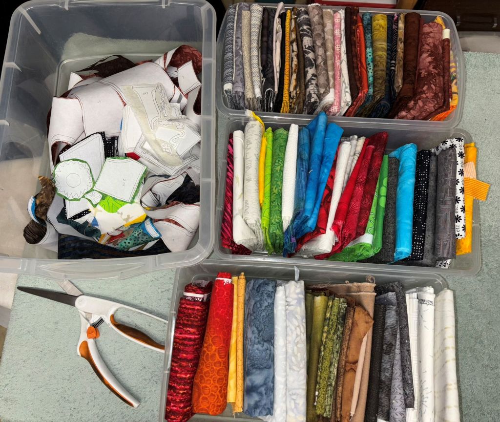 I mean, I think I added 8 gray fabrics to the pile, but it doesn’t look like much more…I did the Exxon sign and some smokestacks, and a bunch of smoke clouds, but that’s about it, and it doesn’t sound like much, but I made it into the 320s I think. Lots of smoke. NO. I’m still not halfway. BUT I have a 3-day weekend (during which I have to finish progress report grades, finish the deck railings, replant some stuff, and move everything back) to finish ironing everything to fabric. I’m getting close to the large goddess figure, and I haven’t entirely decided how to color her. I have ideas. I don’t know which one will work. It requires more brain power than I have right this minute. Hopefully I’ll have it tonight or tomorrow.
