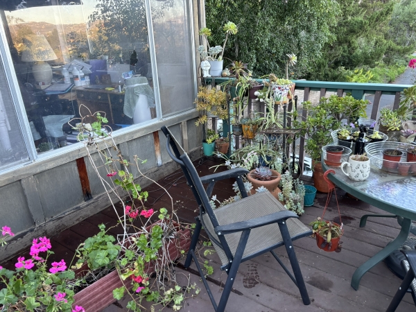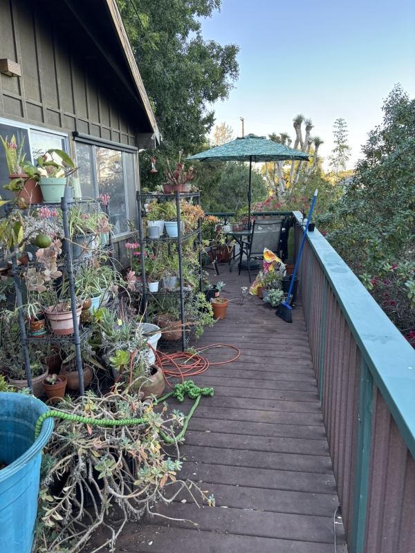 All those planters were up against the railing before, but a lot of them need help. That plant in the front is leggy as hell. I’ve trimmed it before and it does well, so I’m going to do that again.