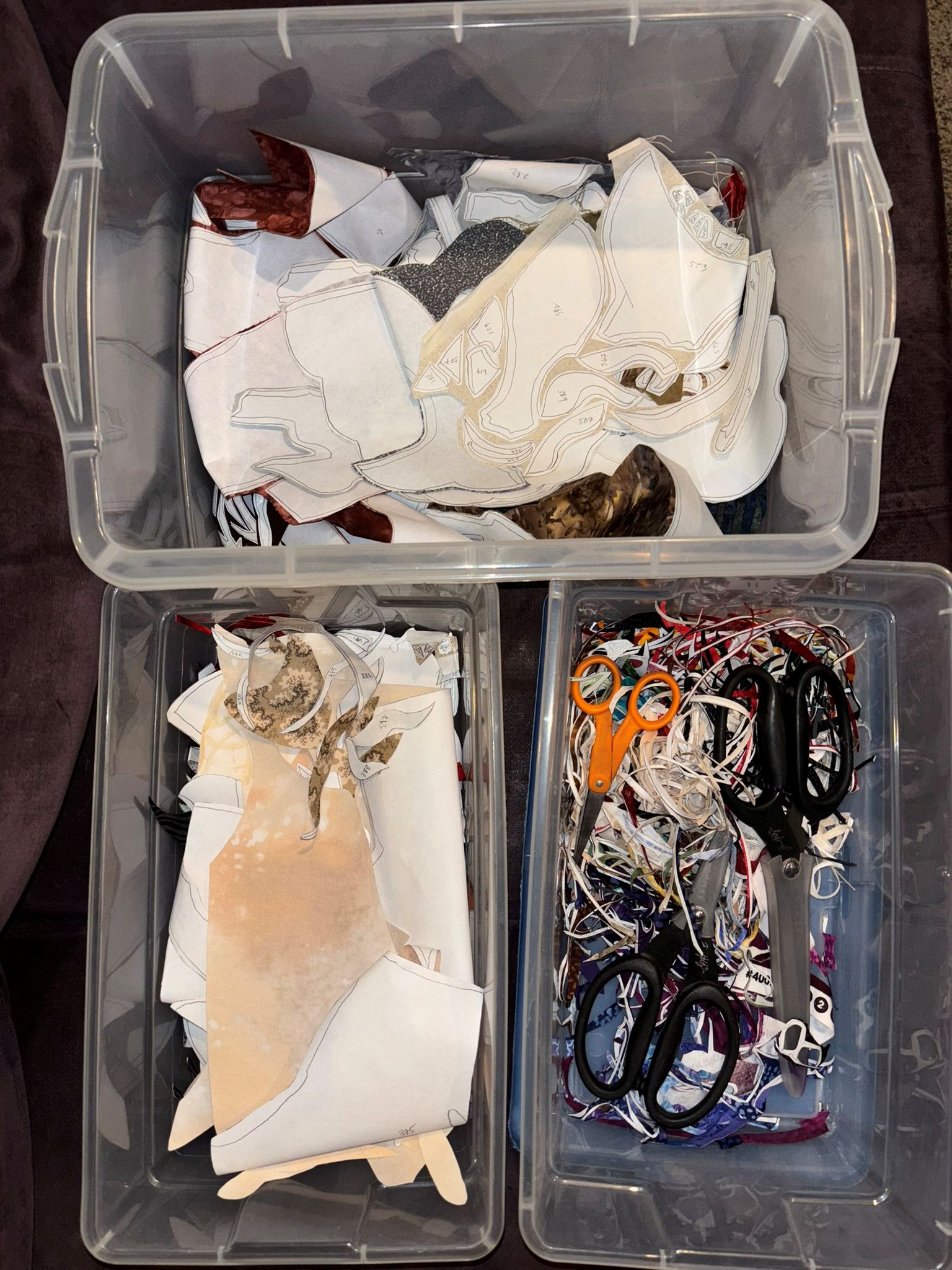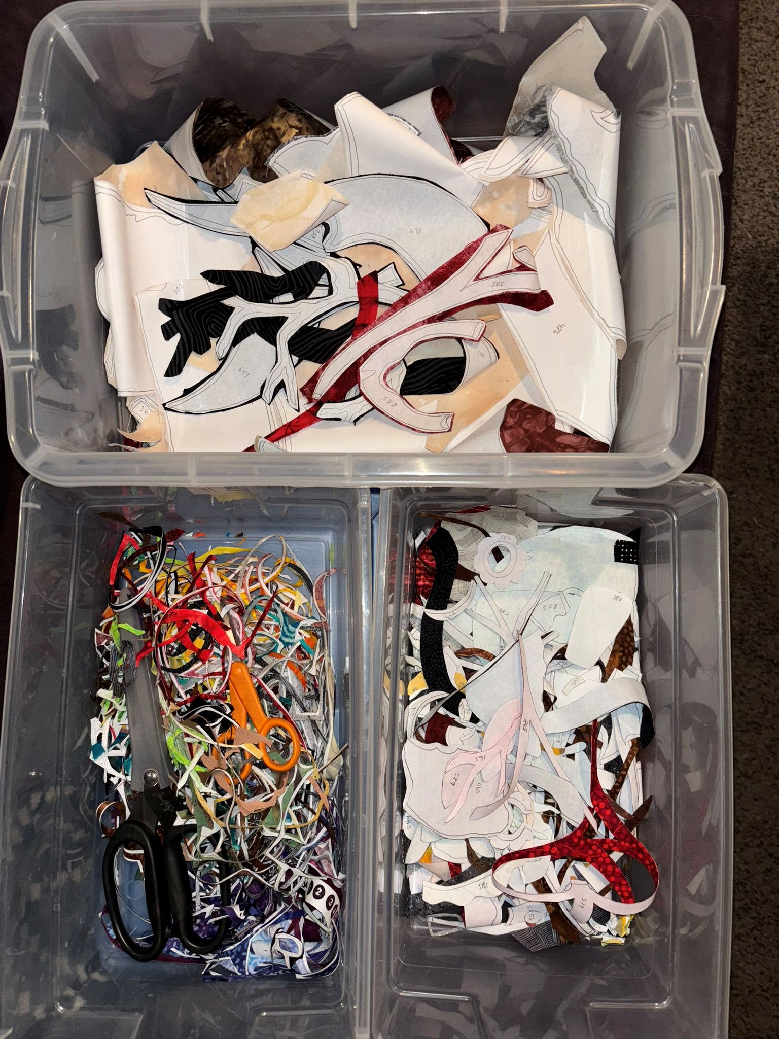 Still trimming tiny pieces. It gets hard to tell the days apart by looking at the bins, especially in the middle. Here’s Wednesday night…