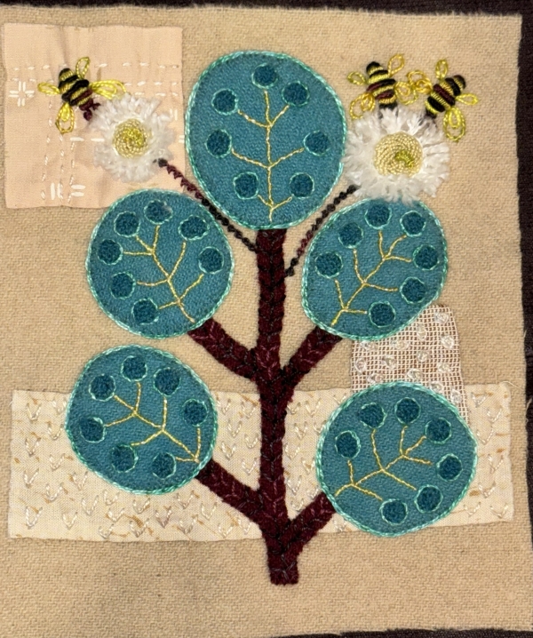 Now they just have to be trimmed, sewn together, and bordered. I think there’s more embroidery on the border, but not as much as on the last one. These are a nice size of block to travel and stitch on. They’re fun to do. I can’t really carry my art quilts with me when I travel, and these are more mindless for me, so easier. Not that I travel a lot, which is why it takes me forever to finish anything. I do have the next one all appliqued down and ready for stitching. I didn’t sign up for the mini one this year…I have a lot of these; I’m way behind, and sometimes they don’t appeal to me…like this year’s. The Christmas tree one my mom and I did together…that was nice because she got to do all the embroidery and keep it. I think I have three minis saved up. Plenty to work on. Hell, I always have plenty to work on.