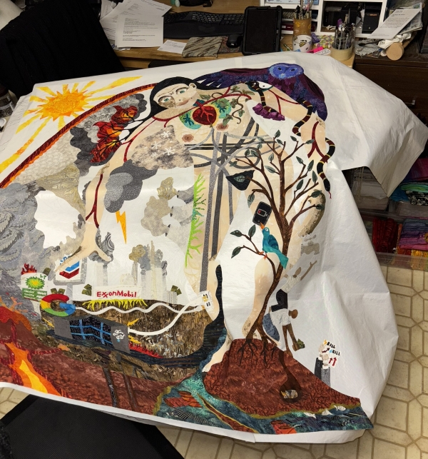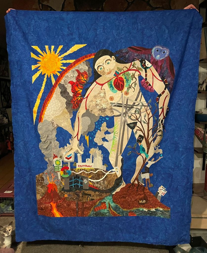 Note Scribble. She posed with it. Sat right down next to it for the photo opp. Now this is at night, with me standing on the fireplace hearth again (I’m short). There’s a ton of details that will get quilted in and that don’t necessarily show up in a photo like this. I guess, that’s normal for me. I will start stitchdown tonight and hopefully get it sandwiched and quilted this weekend. This will most likely be at the New England Quilt Museum in Lowell, MA, in April…and then will travel to a few shows. Which is cool…more about that later, when it’s actually done.