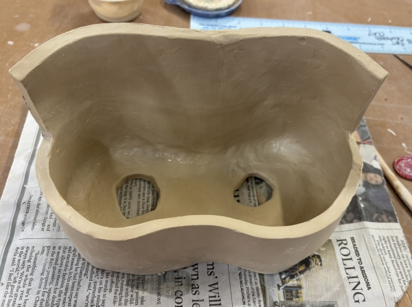 I started a new artsy ceramic piece on Monday. I had a vision (very vague) of what I wanted to do back in December, but was trying to get the bowl done first…there’s only so much room on my shelf for building. And the studio drying shelves were super full; it was hard to find a place to put the bowl last week, so I waited until Monday and found a spot. This is not a very exciting start, but it’s a start…