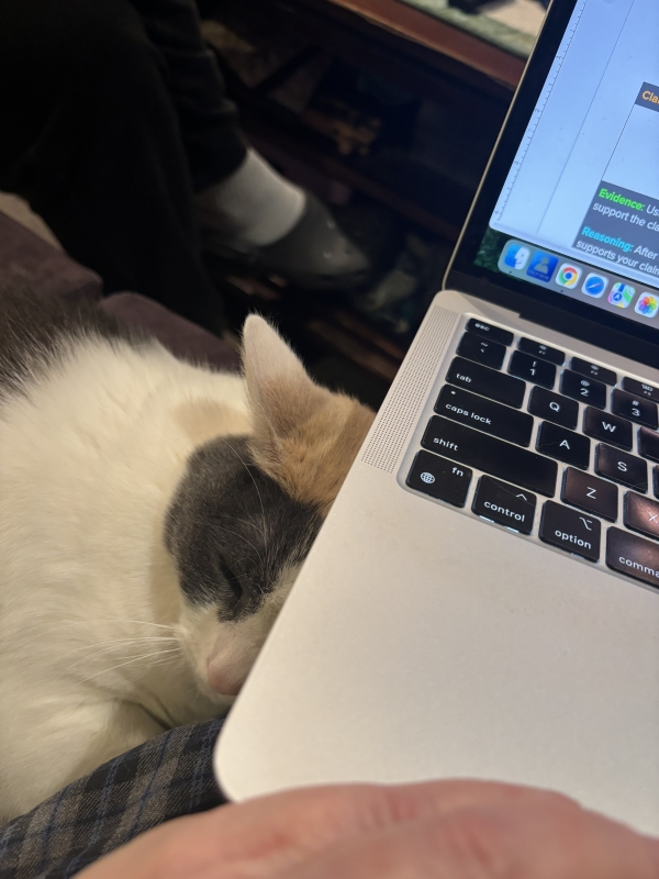 She was on my leg earlier (when I was reading). She sticks a single claw into my leg over and over again. Makes it difficult to concentrate.
