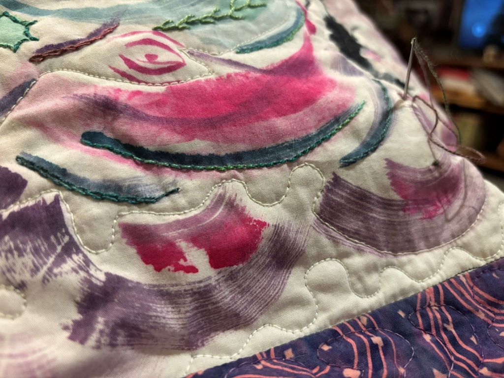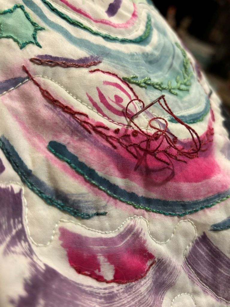 Then I need to find a proper purple; then sequins and beads. Another week? I may pause and do bug legs for a few days. I was too tired for them. They require thought and I’ve been doing yardwork every night and then grading and barely starting embroidery at 9:30 PM and hardly getting an hour in. Ugh.