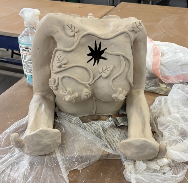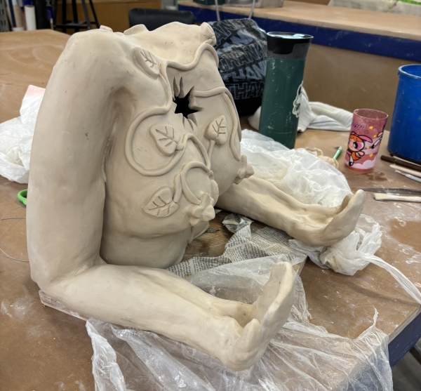 She’s got two arms now and roughouts for hands. I’m trying to do hands differently…put something in them and then carve the fingers, because the fingers are always breaking. We’ll see how that goes. I have to make sure it doesn’t dry out too much so I can’t carve it, and my original plan for the arms changed mid-arm and then I still don’t have enough shelf space available to dry this or start the head and originally there was going to be a barn owl on the head/shoulders and I’m not sure how to pull that off. SO. Yeah. I’m rethinking.