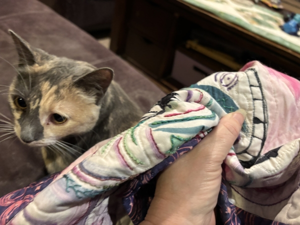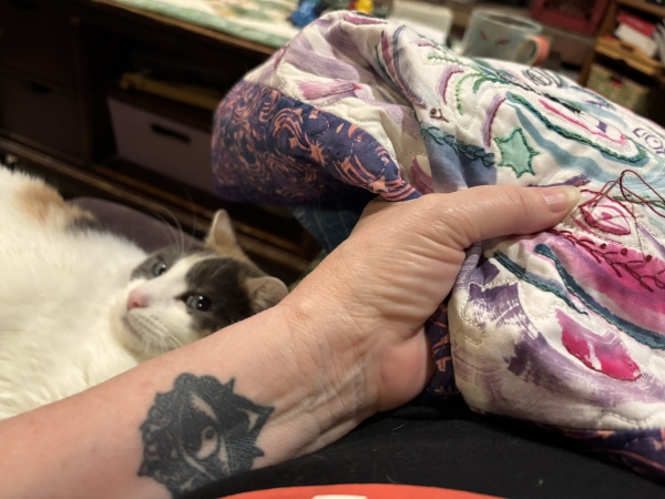 Now with Scribble. I have a few blue-green bits I need to go back and do and then I’m going to figure out what beads and/or sequins I’m going to use. There better be less cat interaction with those.