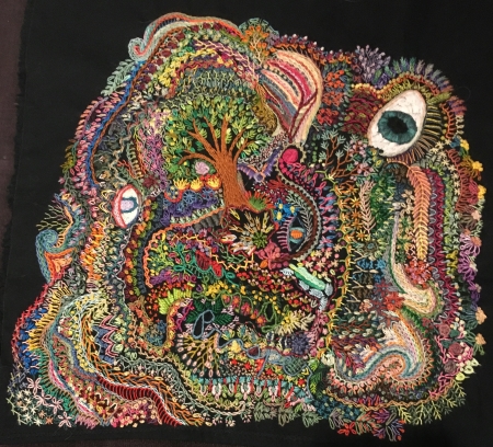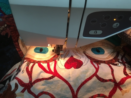 All black fabrics, I’m thinking…and then a bunch of embroidery. But less than in the center. Maybe really small blocks? Maybe small crazy-pieced blocks with narrow bits and a larger center bit for a motif. I’m freaking out because I’m totally seeing a face on the right side…with that wave curve as the nose. There are three eyeballs in this thing. And a hand. It’s not the most normal thing in the world. Shockingly.