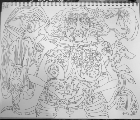 Then how do I pick the colors? Usually I have some idea of the coloring of the quilt in general, mostly the main figure against the background. Because this one was about how the Earth was being damaged, I wanted the Mother Earth figure and all the people in the main part of the quilt to be grayed out. I started with her, making her mostly shades of white to gray, and then the smaller figures in the section were a range of blue-grays, which sit on the blue background. So I really thought this one out. That said, I never sat down with colored pencils or a computer and colored in a drawing. It’s all in my head.