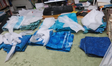 I was pretty tired tonight, but wanted to get further along than just the bones, so I figured I would need about 10 water fabrics…I laid them out light to dark and started putting the appropriate Wonder Under pieces on top…