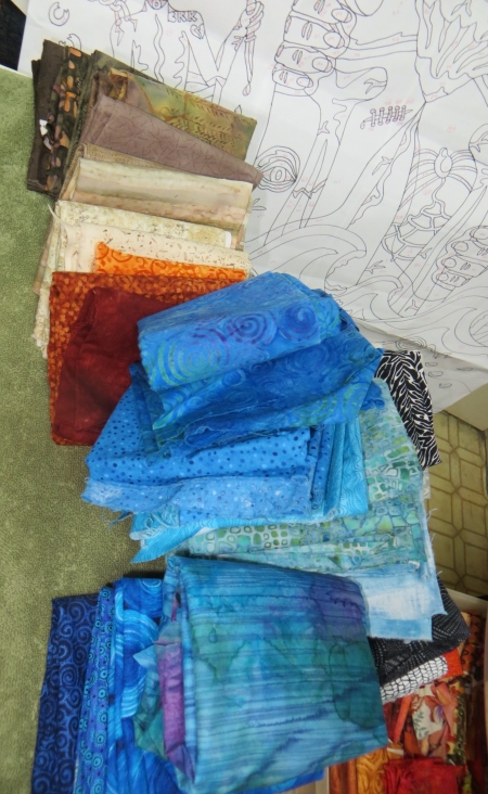 Here’s all the fabrics I’ve used so far (well, all the grays and blacks are hiding underneath)…