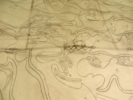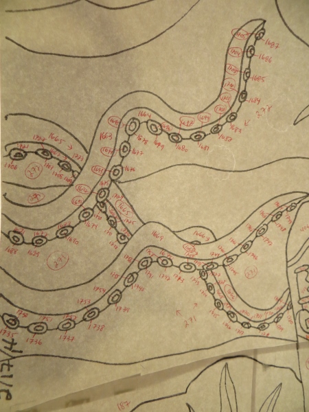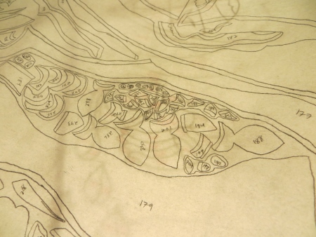 The next step is seaweed and fish. I’ve ironed about 250 pieces down at this point, and am about 3 1/2 hours in. I had the same problems with the blue fabrics that I did with the browns…I needed to make sure I had a big enough piece to iron the wider pieces down. Luckily, I seem to have more large blue pieces than brown, probably because I often use blue as a background, and that leaves these random skinny yet wide pieces that work well for water.